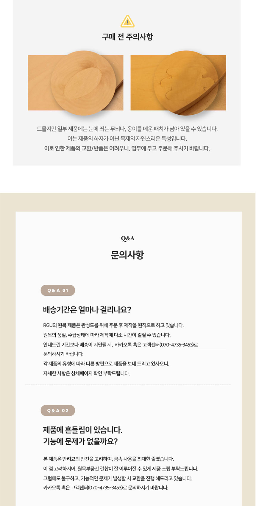 - 상품 및 상품 구매 과정과 관련 없는 비방, 욕설 등 부적절한 게시글 등록 시 글쓰기 제한 및 게시글이 삭제 조치 될 수 있습니다.